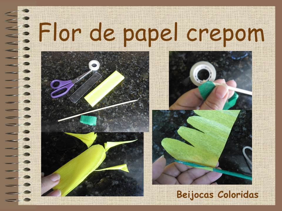 A mesma flor pode ser feita sem palito para colar diretamente numa cesta ou painel. Assim como o mesmo esquema de franzir e ir girando pode ser feito sem cortar o papel fazendo um cravo de crepom. Caprichem na fita adesiva no acabamento, senão ela solta!